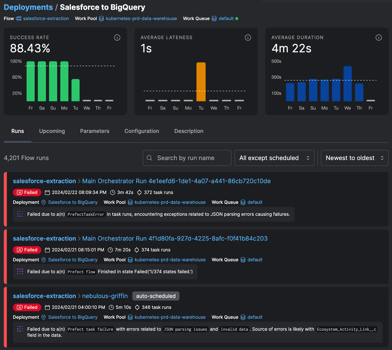 For instance, the Prefect deployment view enables observing key metrics for your data pipelines and workflows. You can click on any run to see what failed and why.