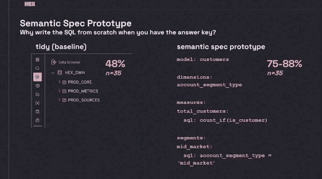 Defining a semantic layer for your LLM models (and your team) is another step toward improving accuracy. Clear, precise definitions of calculations and segment names provide even more clarity. The Hex team found that defining semantics increased LLM accuracy by around 35%.