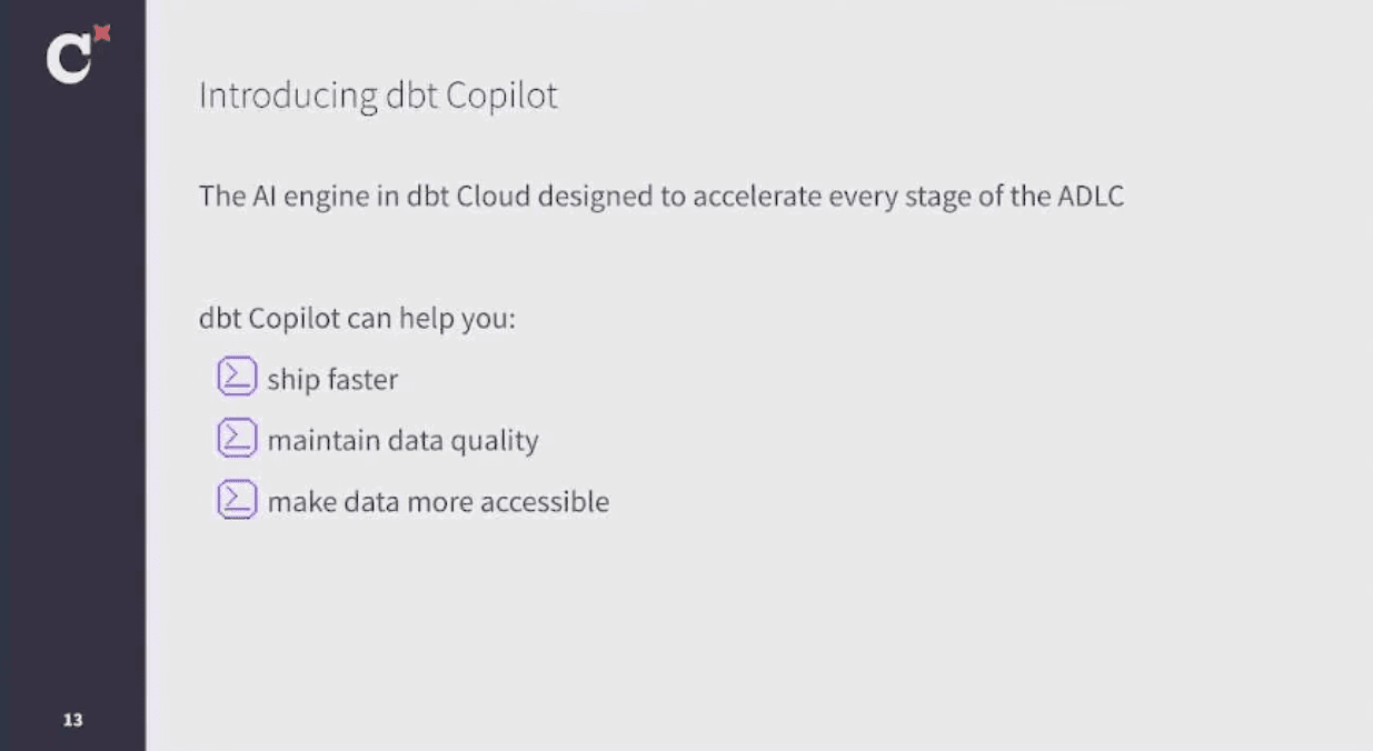 Speaking of AI, dbt announced a new feature at Coalesce: dbt Copilot. If you’re familiar with GitHub Copilot, you probably have an idea of what this tool does. Simply put, dbt Copilot helps you generate code in dbt through an LLM, whether you’re developing, testing, or analyzing.