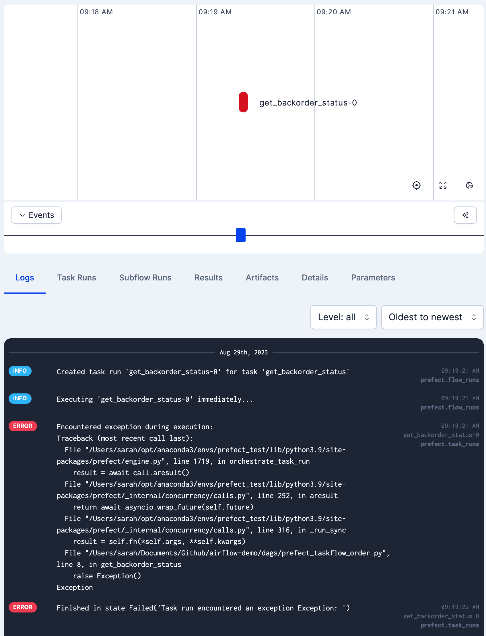 2️⃣ Clear exception debugging and validation. By running the workflow from your terminal, errors will show up in the logs where you’re already testing. In Prefect Cloud, the dashboard will give you a birds eye view into the health of all the pieces of Prefect.