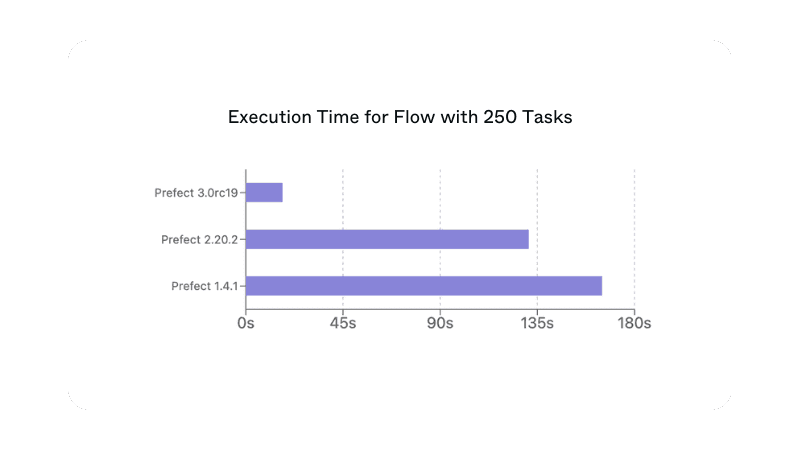 To demonstrate this improvement, we benchmarked the same flow against Prefect Cloud’s API across all three major Prefect SDK versions. Each flow iterates over a list of 250 integers in sequence and executes a basic task that increments each integer by one.