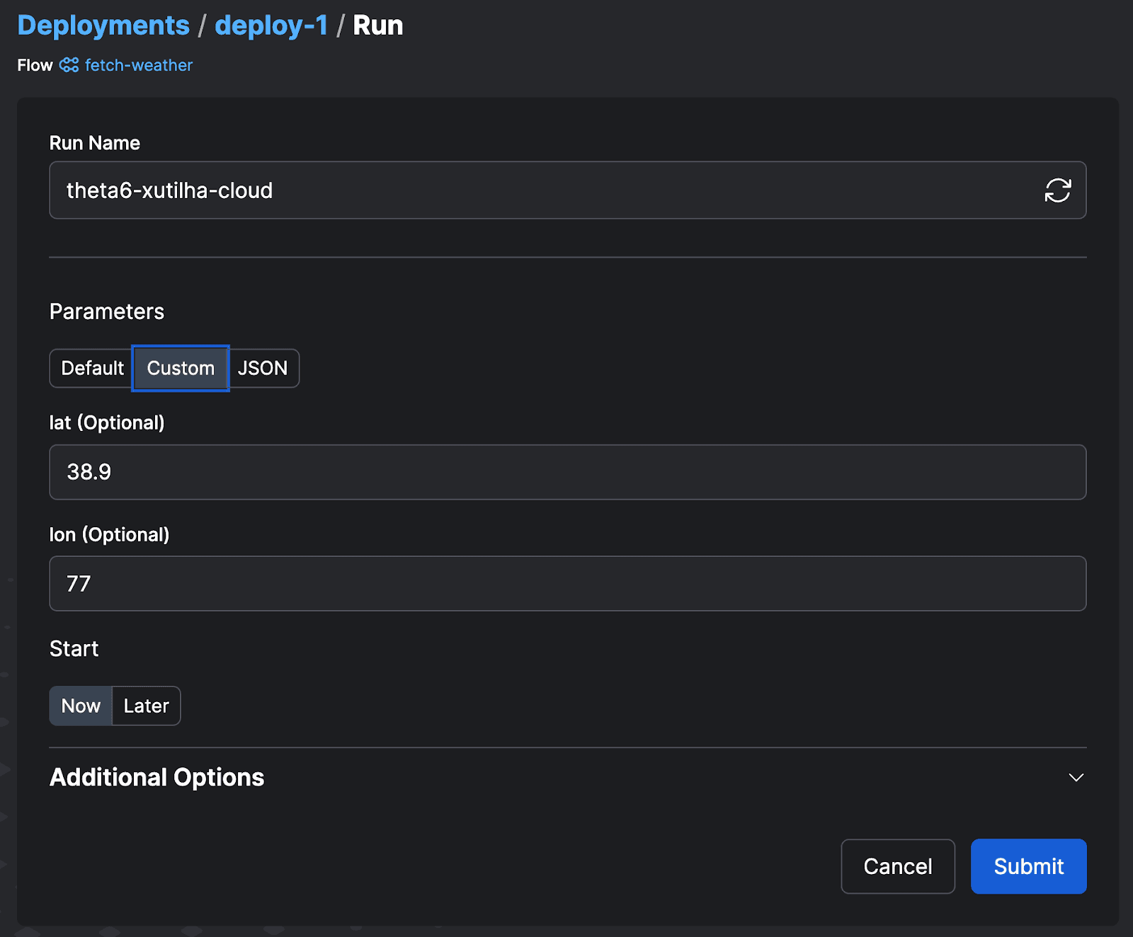 Under the hood, Prefect uses Pydantic, so parameters can be limited to a list of choices through enums. Authors can even create a custom Pydantic class to require that a value in a valid email address format is provided or ensure a maximum or minimum numeric value.