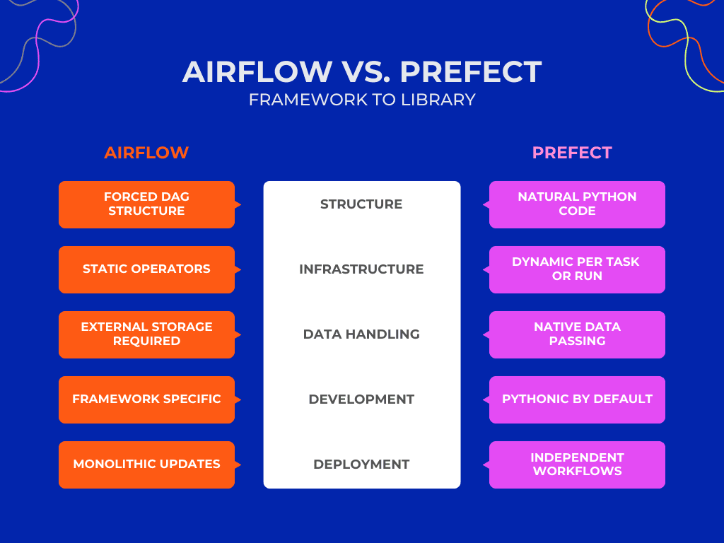 What can account for this change? The core difference between Airflow and Prefect is simple: Airflow is a framework that forces your code to follow its rules, while Prefect is a library that adapts to your Python code. This is why migration to Prefect is far less disruptive than teams expect.
