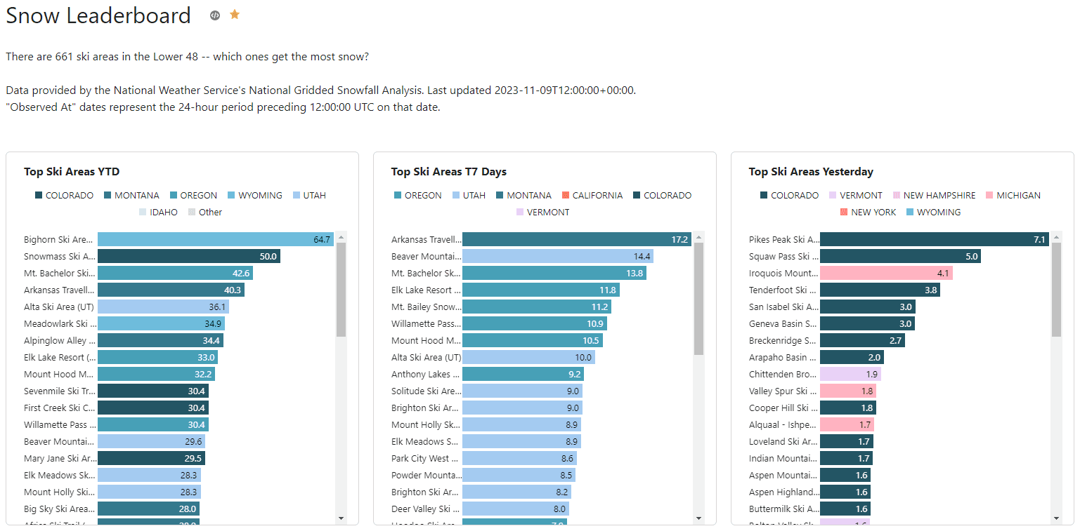 This post walks through building a leaderboard for snowfall at ski resorts in the U.S., powered by Hashboard and Prefect. The leaderboard uses up-to-date data that winter sports enthusiasts can use to track winter storms and see where the snow is falling; the application portion responds to specific events like huge powder days and triggers notifications to specific individuals. Relying on the National Gridded Snowfall Analysis dataset, it only took a couple days to build an end-to-end leaderboard with an interactive frontend and API-driven backend. Check out the Snow Leaderboard and keep reading to discover how we built a lightweight yet fully-featured data application.