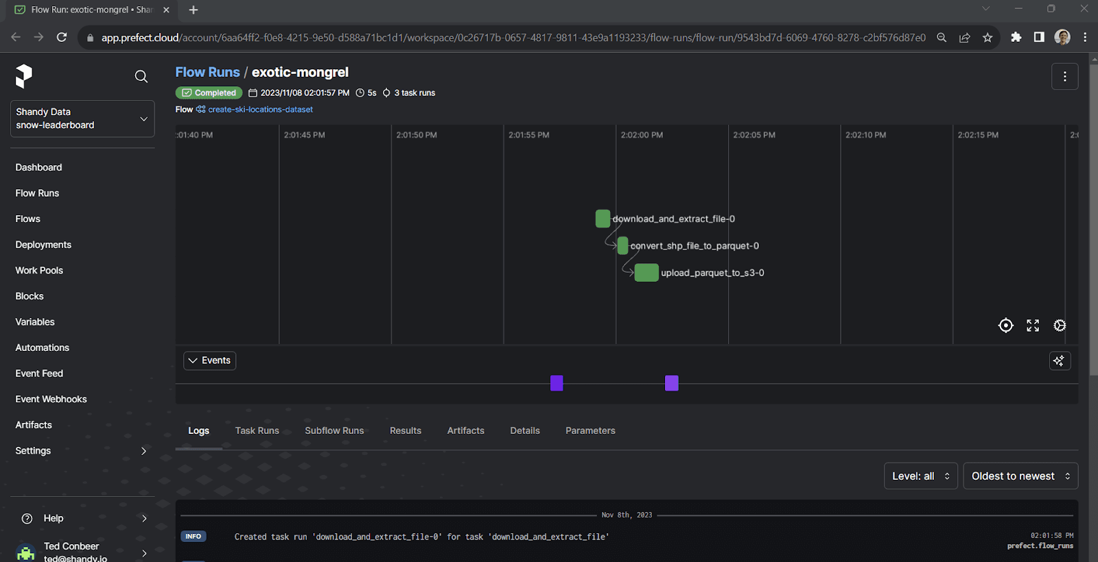 logger.info("Created ski resort parquet file at %s", s3_uri)Running the flow is as easy as calling the function, which we can do from the command line by executing our script. Prefect’s logging streams updates as the flow progresses: