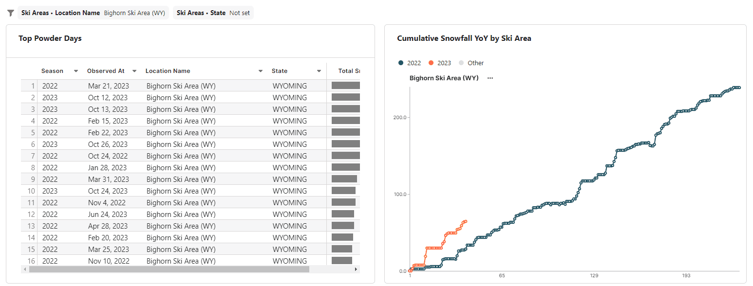 The second section of our dashboard highlights a single resort and shows top powder days and year-over-year trends: