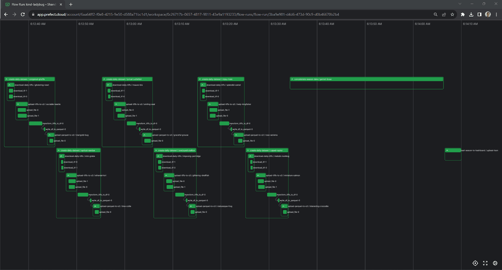 update_dashboard_filter(season=season)After running this flow, we can view it, along with all of its nested subflows and tasks, in the Prefect Cloud UI: