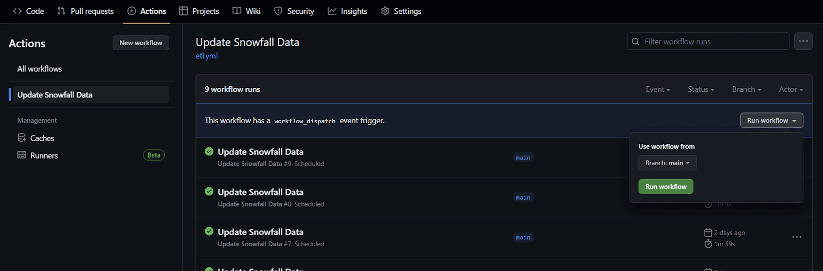 We merge our branch with the .yml file to main, and we’re done! We can verify the workflow by invoking it from the GitHub UI: