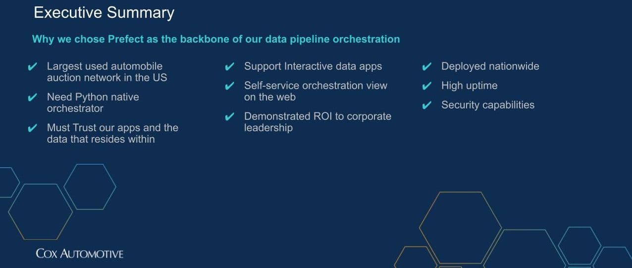 Organizations like Cox Automotive are looking to build their next generation of data tools to take advantage of innovation without compromising the trust of their users. You can find more information on how Prefect is enabling this trust with transactional, flexible, and portable orchestration, including John’s talk on Cox Automotive’s journey to Prefect, on our Prefect Summit recap page.