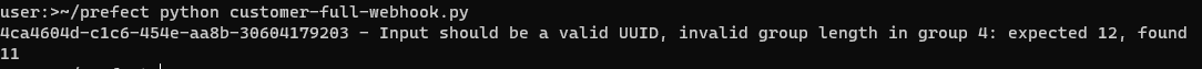 print(f'{error["input"]} - {error["msg"]}')The call to create a Customer object will run without error. If you somehow lose a digit on the UUID, however, you’ll get a failure: "guid": "4ca4604d-c1c6-454e-aa8b-30604179203"