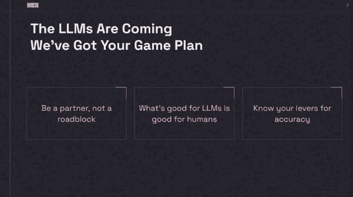 Their game plan boiled down to three main points: “Be a partner, not a roadblock,” “What’s good for LLMs is good for humans,” and “Know your levers for accuracy.”
