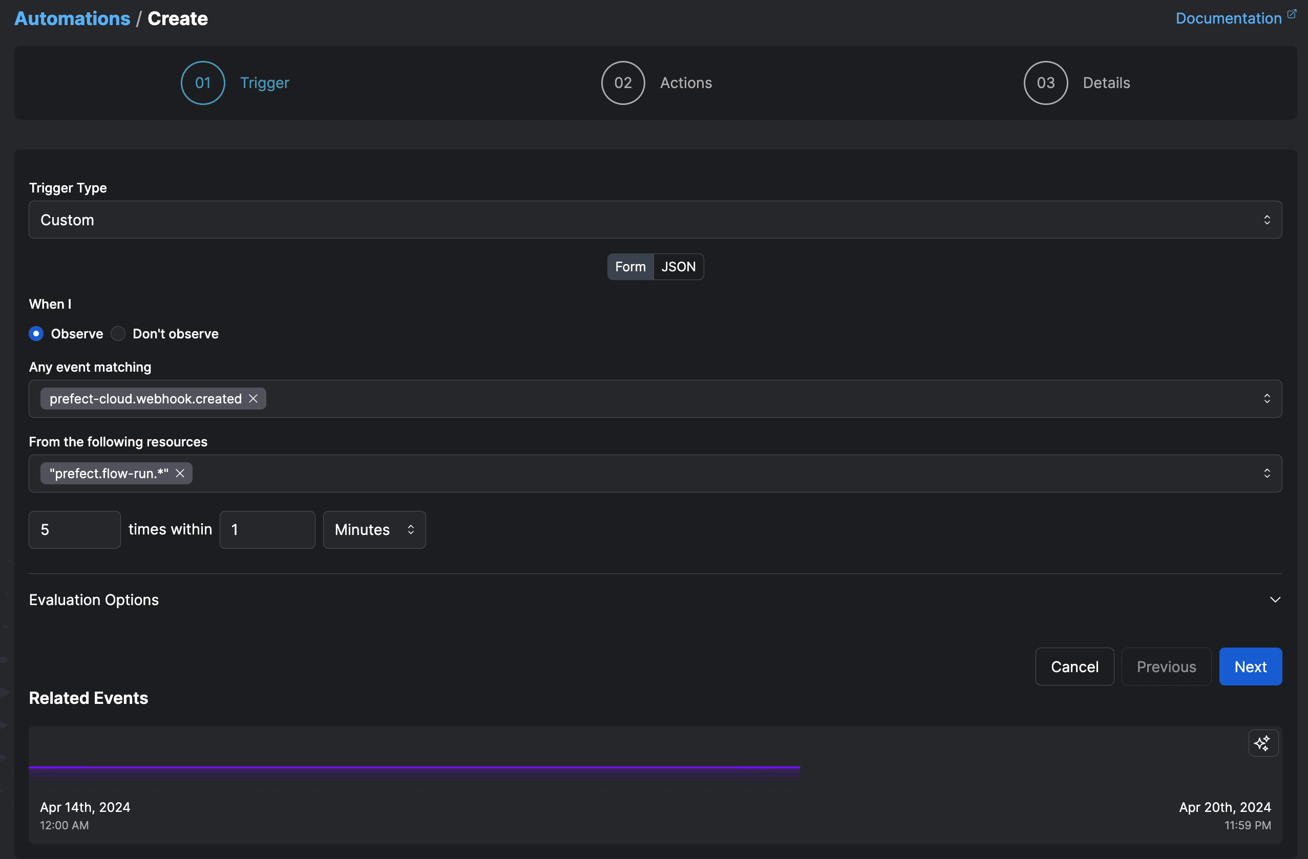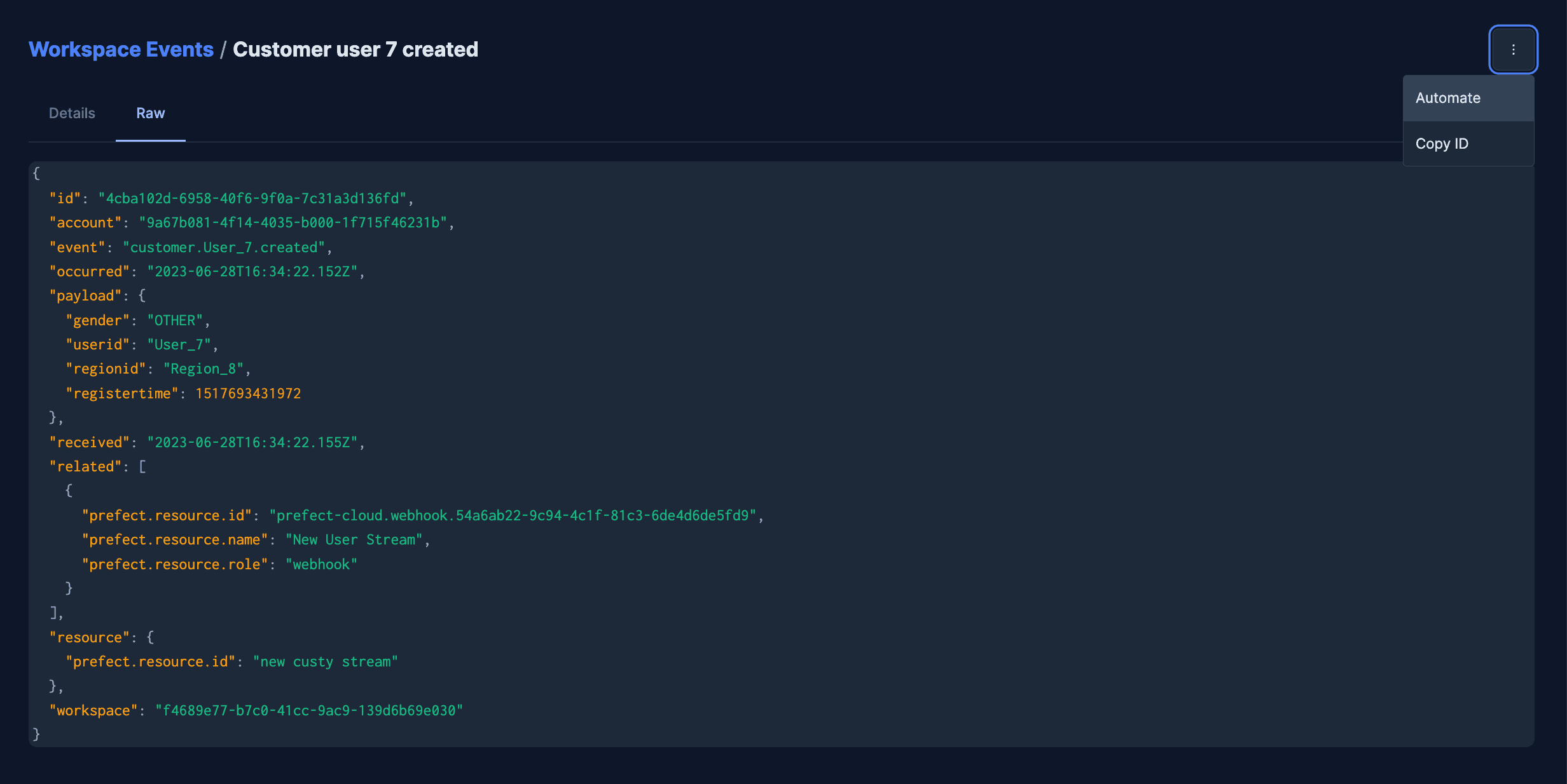 new_user_flow(name="will")I need this flow to run when a new user event hits my system, using the user id from the event payload as the input parameter to the flow. There are a number of ways to do this both in code and the UI, but the simplest way is to navigate to an event like the ones you want to use to trigger your flow run, and click automate.