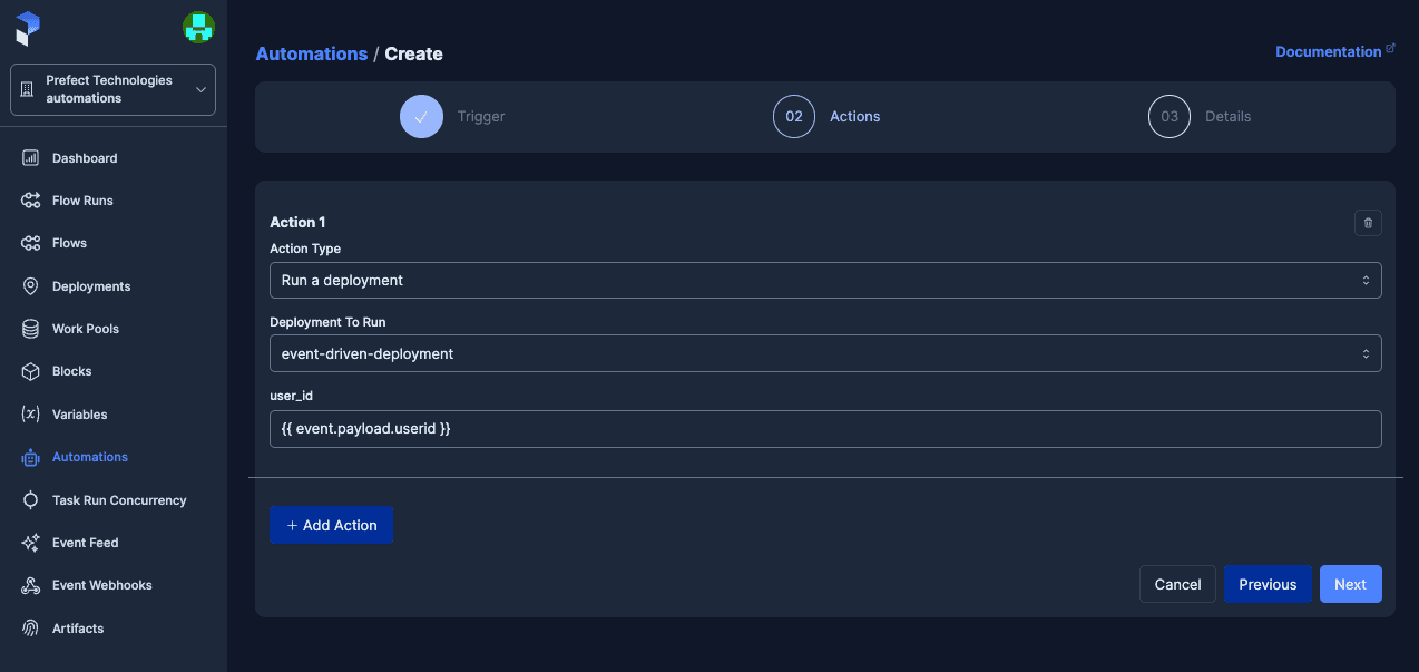 You'll notice some interesting syntax in the user_id field. Automations capture information from the event that triggered them, and you use Jinja syntax to pass that information into your flow run at runtime. {{ event.payload.userid }} says to take the userid from the event we captured, and use that as the main parameter value for the flow. On creation, this automation is now linked to the deployment and visible on the deployment details page under "Triggers".