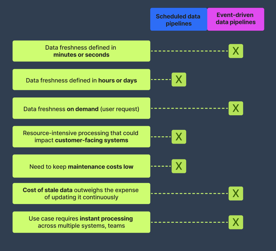 We can summarize all of the above in the guide below. Use these guidelines to decide when a scheduled data pipeline would work versus when it makes sense to make the extra investment in an event-driven solution.