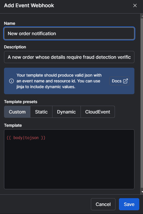 You can implement an event-driven data pipeline on Prefect in just a few steps. First, you create a webhook. The screenshot below shows how you’d define a webhook in Prefect. Once defined, Prefect will supply a URL you can register in your external system - e.g., as an Httpsink in Confluent: