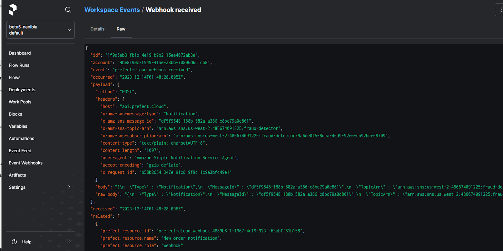 Prefect supports Jinja templates so that you can transform the JSON payload from Amazon SNS into any format you need. In this case, we use a pass-through command to send our job the raw JSON data.