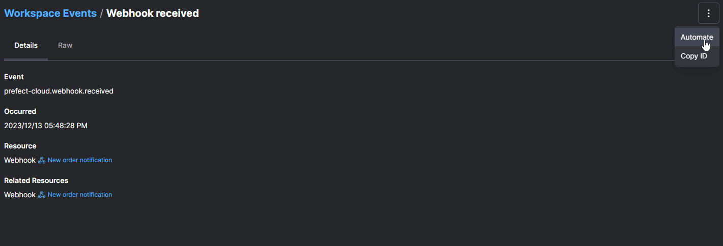 process_request.serve(name="process-request-deployment")After deploying our flow, we can select a sample event from our Event Feed and use the Automate command to create a trigger and select the deployment to invoke.