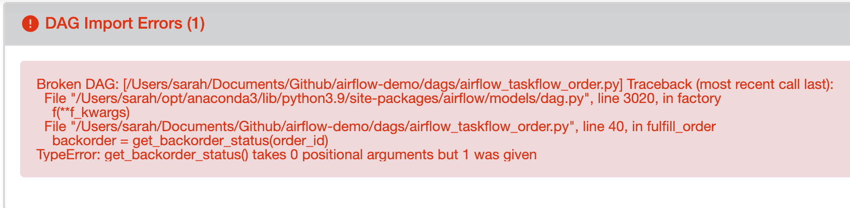 These errors don’t automagically update when you fix the code. The webserver is unfortunately more static than you’d expect. While certain pieces have auto-refresh, the main page doesn’t (yet—I sincerely hope they add it, considering this code was written with the most recent stable version of Airflow: 2.7).