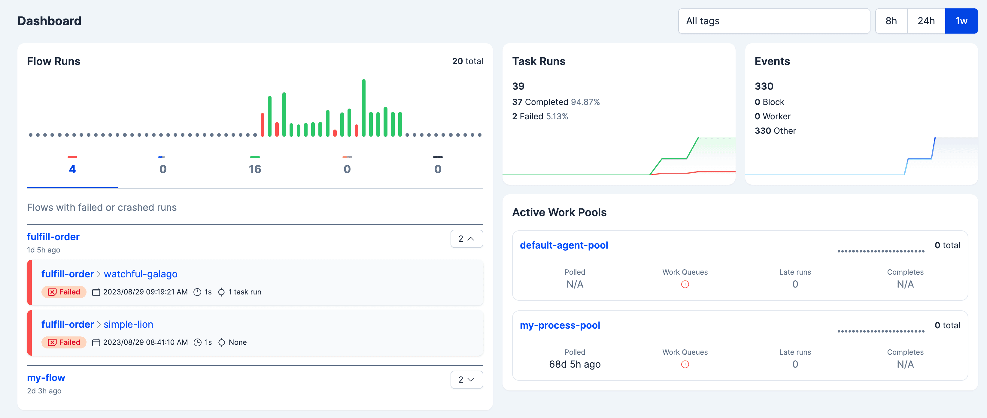 2️⃣ Clear exception debugging and validation. By running the workflow from your terminal, errors will show up in the logs where you’re already testing. In Prefect Cloud, the dashboard will give you a birds eye view into the health of all the pieces of Prefect.
