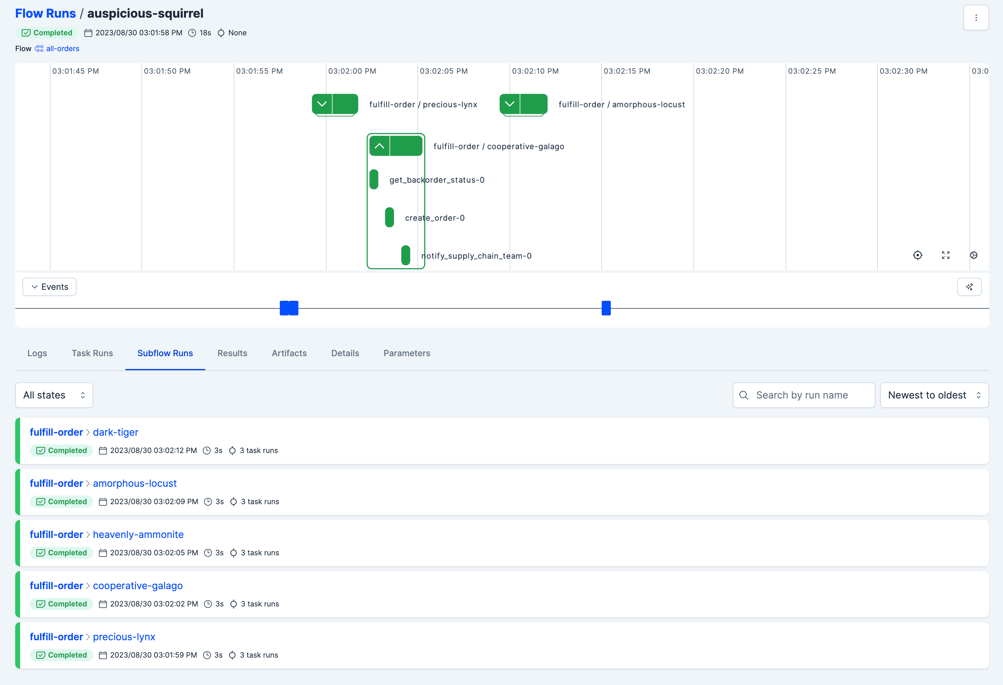 This section is divided into two subsections (I know, stay with me here)—first when running our toy workflow as is, and second when getting closer to reality: running multiple orders, which throws a wrench into things.