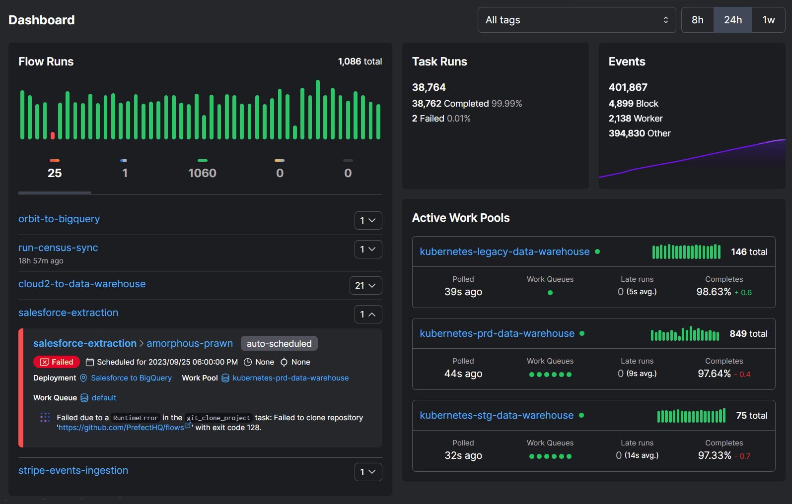 Users love Prefect because it gives them observability across all of their data, and a control panel upon which they can rely to always know the state of their workflows. This becomes especially relevant when they fail. Here is a snapshot of our own Prefect dashboard for our internal tools: