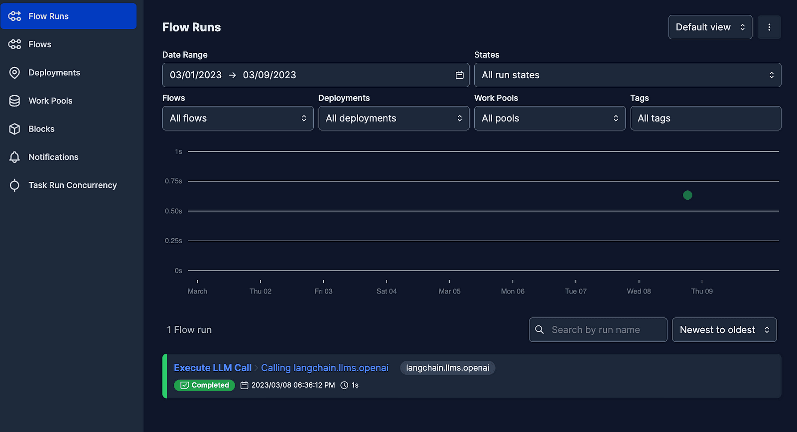 With langchain-prefect you get prefect. With Prefect, you can wrap arbitrary Python functions in a @flow decorator so when you run one of them, metadata on that execution is tracked (see footnotes).