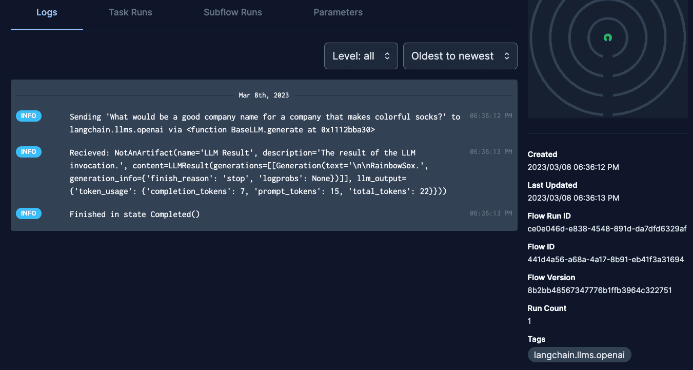17:45:22.211 | INFO | Flow run 'Calling langchain.llms.openai' - Recieved: NotAnArtifact(name='LLM Result', description='The result of the LLM invocation.', content=LLMResult(generations=[[Generation(text='\n\nHappy Feet Socks.', generation_info={'finish_reason': 'stop', 'logprobs': None})]], llm_output={'token_usage': {'completion_tokens': 7, 'total_tokens': 22, 'prompt_tokens': 15}}))