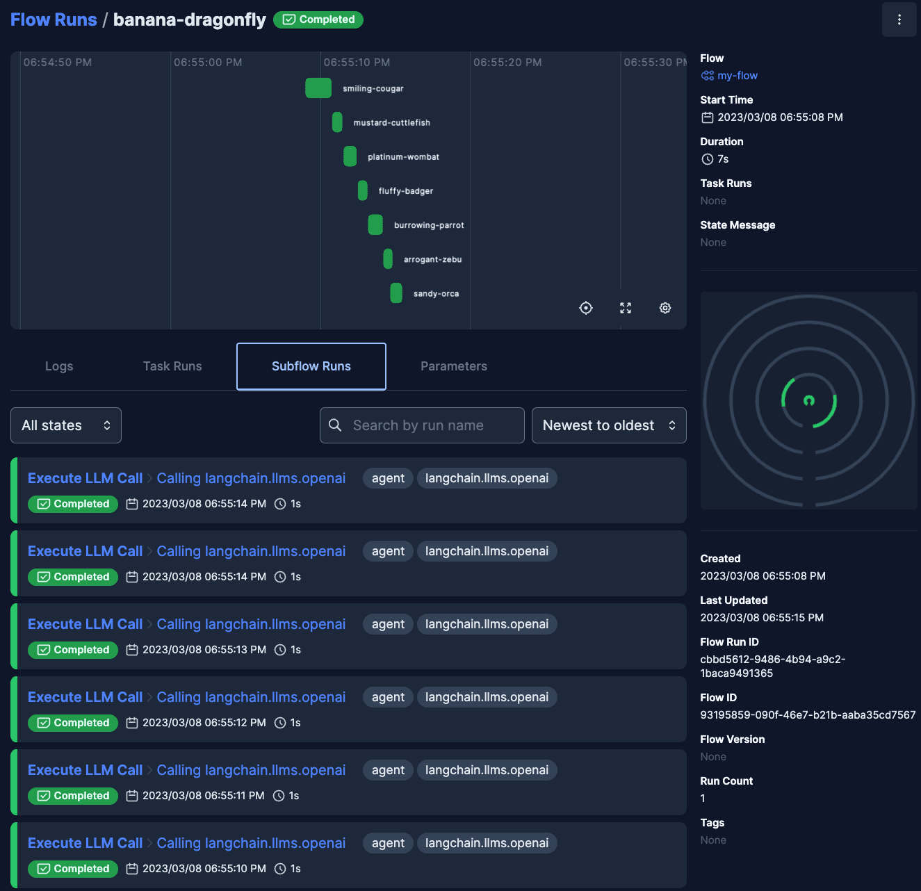 Prefect UI showing the subflow runs (i.e. LLM calls) of my_flow
