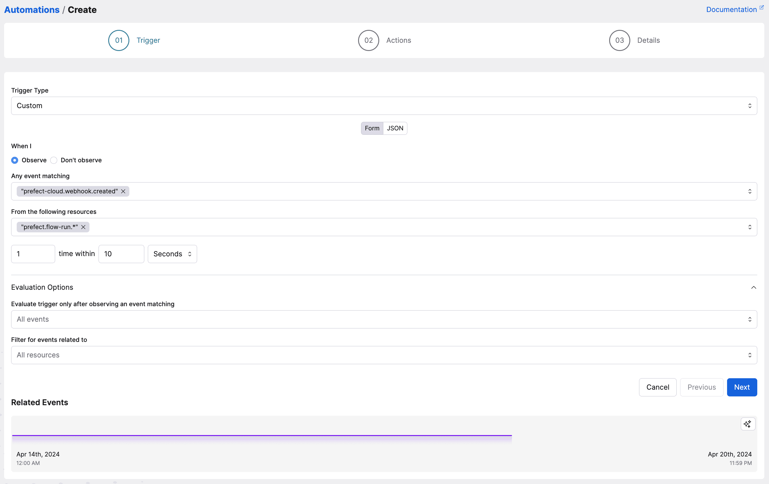3. Create an automation in Prefect Cloud. The automation takes a trigger—the webhook you created in step 1—and will submit an action to occur. An automation can trigger virtually any behavior in Prefect Cloud: from running a Python script, to launching infrastructure, or just sending a Slack notification. The last piece is what we will implement here.