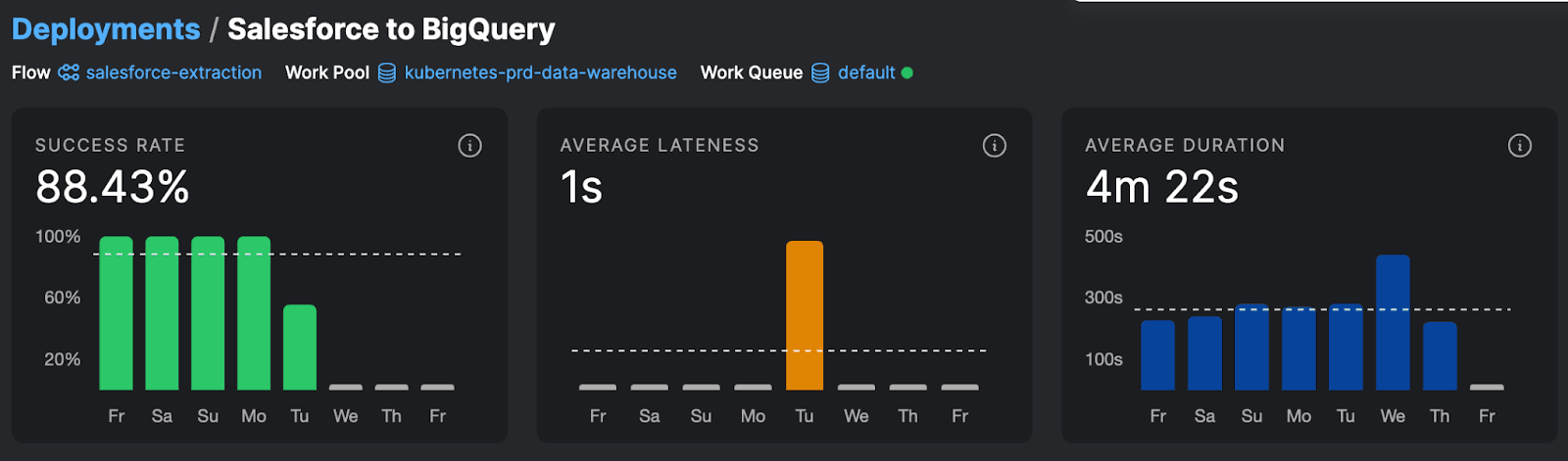 Prefect’s customers use our workflow orchestration and observability platform to run thousands of critical, distributed workflows. Based on their feedback, we’ve identified three critical metrics that we feature prominently on our customer dashboards: lateness, success rate, and duration.