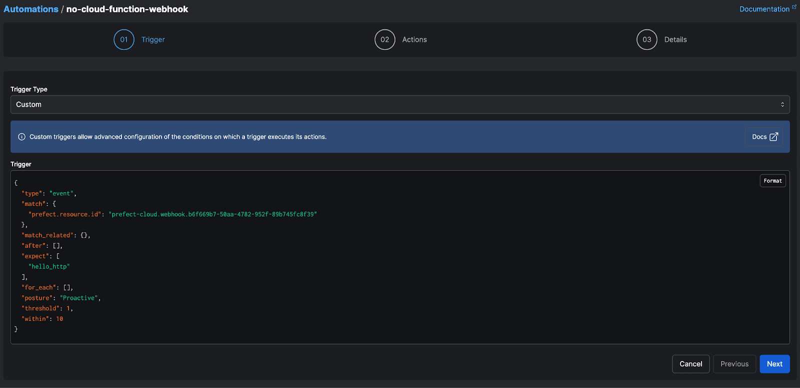 For example, assume you have a critical serverless function running in a cloud provider. You want to get an alert if the function hasn’t fired in the past 30 minutes. Using Prefect, you can create a webhook that receives an event via an HTTP callback from the remote function. You can define the webhook with a proactive posture, meaning you’ll want to generate an alert in the absence of activity. The example below shows a callback that should receive one call every 10 seconds:
