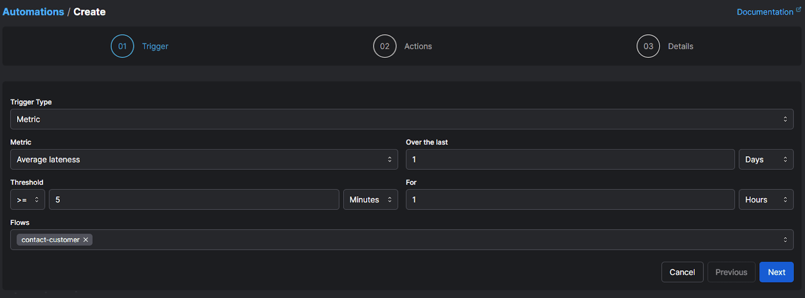 You can also define a metrics trigger that fires if a flow meets certain threshold criteria. For example, the automation below will run if the flow runs an average of 5 minutes late over the last hour: