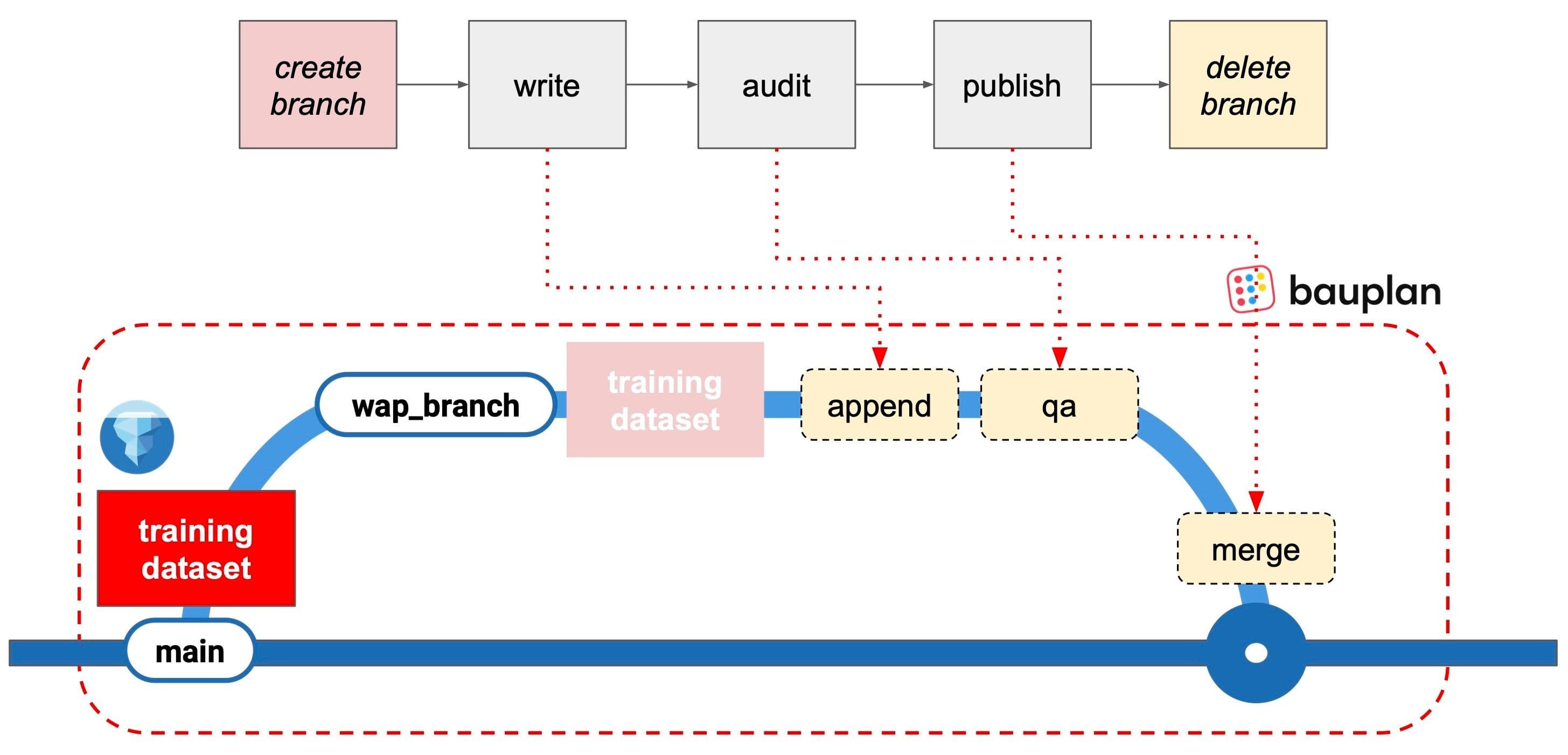 Perhaps more surprising is that we indeed see a “recursive transaction” down at the data level: Bauplan datasets are stored as Iceberg tables, so modifications can happen on a zero-copy clone of the production tables - simply put, Bauplan allows us to create a new branch of our data lake and perform ingestion and data quality checks completely sandboxed from production. Only when “audit” succeeds, we “merge” back into the production branch, and all the downstream changes (i.e. the new rows appended) become visible to downstream consumers; if “audit” fails, we raise the exception to the outer loop, which will trigger the clean-up via rollback.