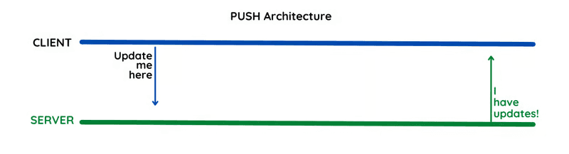 A push architecture is event-driven: the server pushes data to clients as updates become available. With our data orchestrator acting as a client, instructions for which task to execute next would be pushed to the client by a data asset when it changes state.