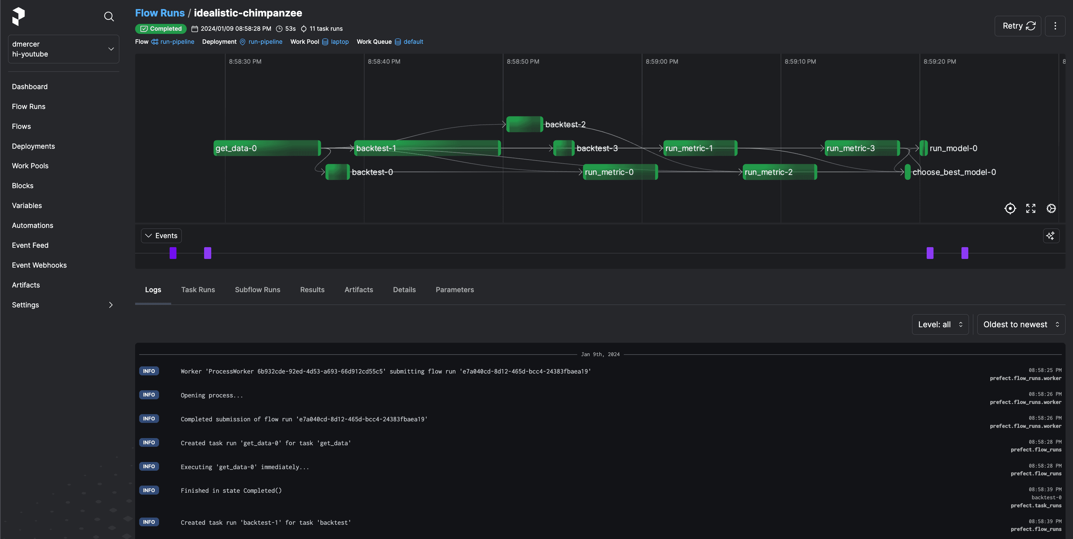 A task’s map method lets us easily submit a task run for each item in an iterable. In our case, we can use it to create a task run for each of our models. However, the backtest task requires our data DataFrame. Since data is iterable, if we aren’t careful we’d create a task run for each element in our dataset. To avoid that, we can use the unmapped annotation.