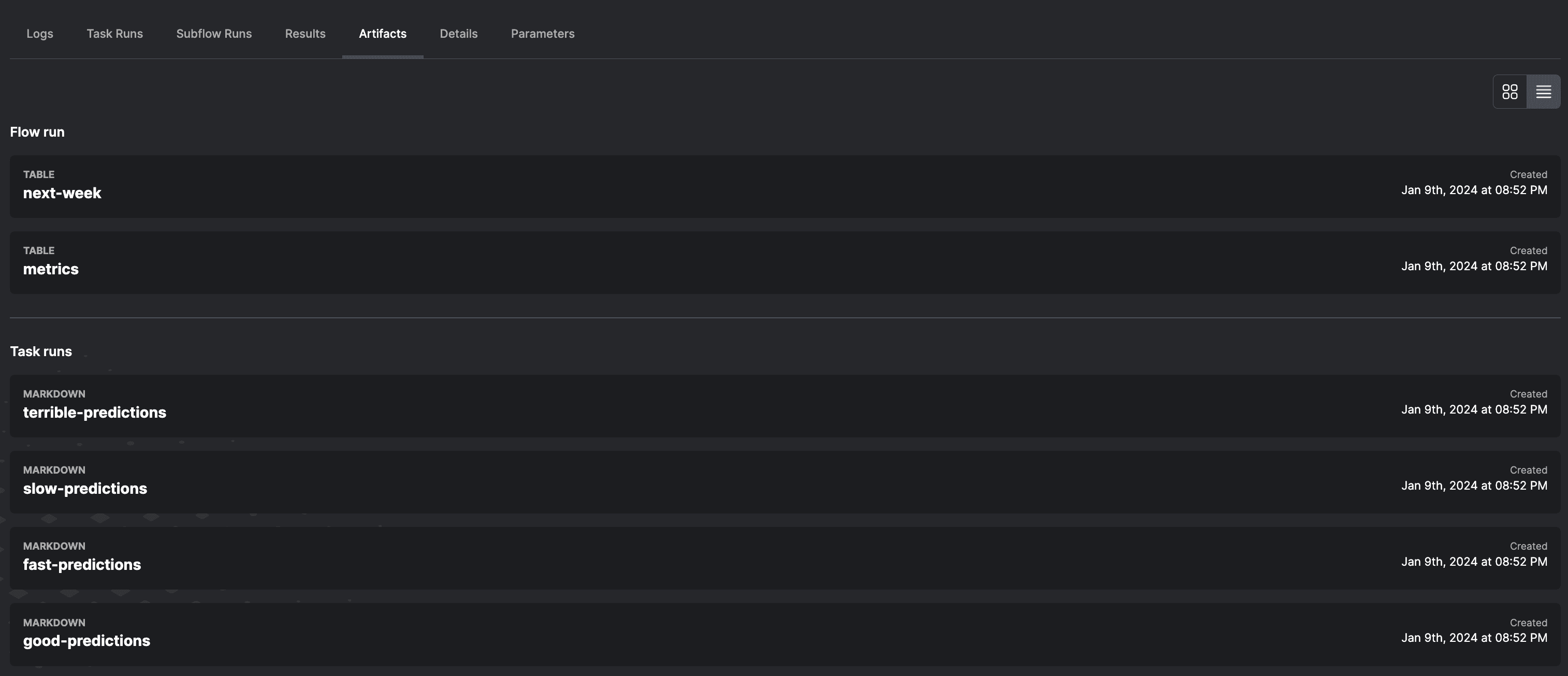 return next_weekEvery time we run our flow, we’re overwriting last week’s results. That’s not good, but there’s an easy fix. We can use Prefect’s artifact system to create artifacts. Artifacts in Prefect are just stored pieces of data that are generated within flow or task runs. Rather than writing our predictions as a Markdown file to disk, we can create a Markdown report using the create_markdown_artifact function.