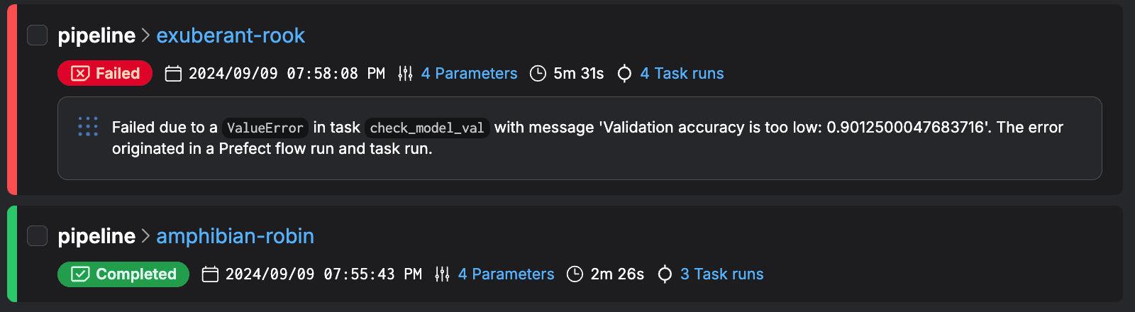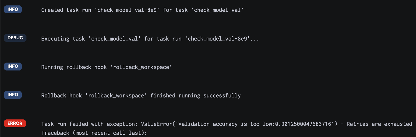 9,0.9539999961853027,0.12576799094676971,0.9012500047683716,0.3672797381877899We’ve got new results, but because they didn’t meet the threshold in our check_model_val task, we raised an error.