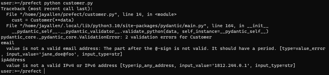 print(f'{error["input"]} - {error["msg"]}')Next, you can turn this into a Prefect workflow and run it in response to an event - such as an upload of a file to Amazon S3 - or an API call from an external application. To do so, install Prefect into your machine or virtualenv: pip install -U prefect