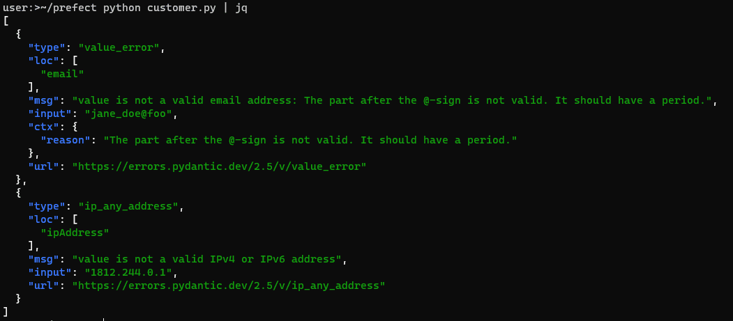 print(e.json())If any validation check fails, Pydantic will return a ValidationError object that contains an array of errors. The code above converts this to JSON so you can see how Python formats each error object: