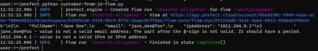 You can run this file by logging into Prefect Cloud (create an account if you don’t have one already): prefect cloud login, and then running: python customer-from-js-flow.py