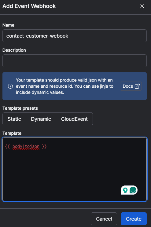 To create a webhook, login to Prefect and, from the navigation menu, select Event Webhooks. Select the + button and then add a dynamic webhook that passes through the JSON body you send in your request: