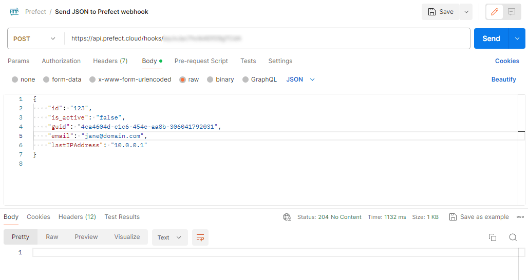 This will create a webhook URL that you can call from any application. For example, you can call it with a simple POST with a JSON body via Postman: