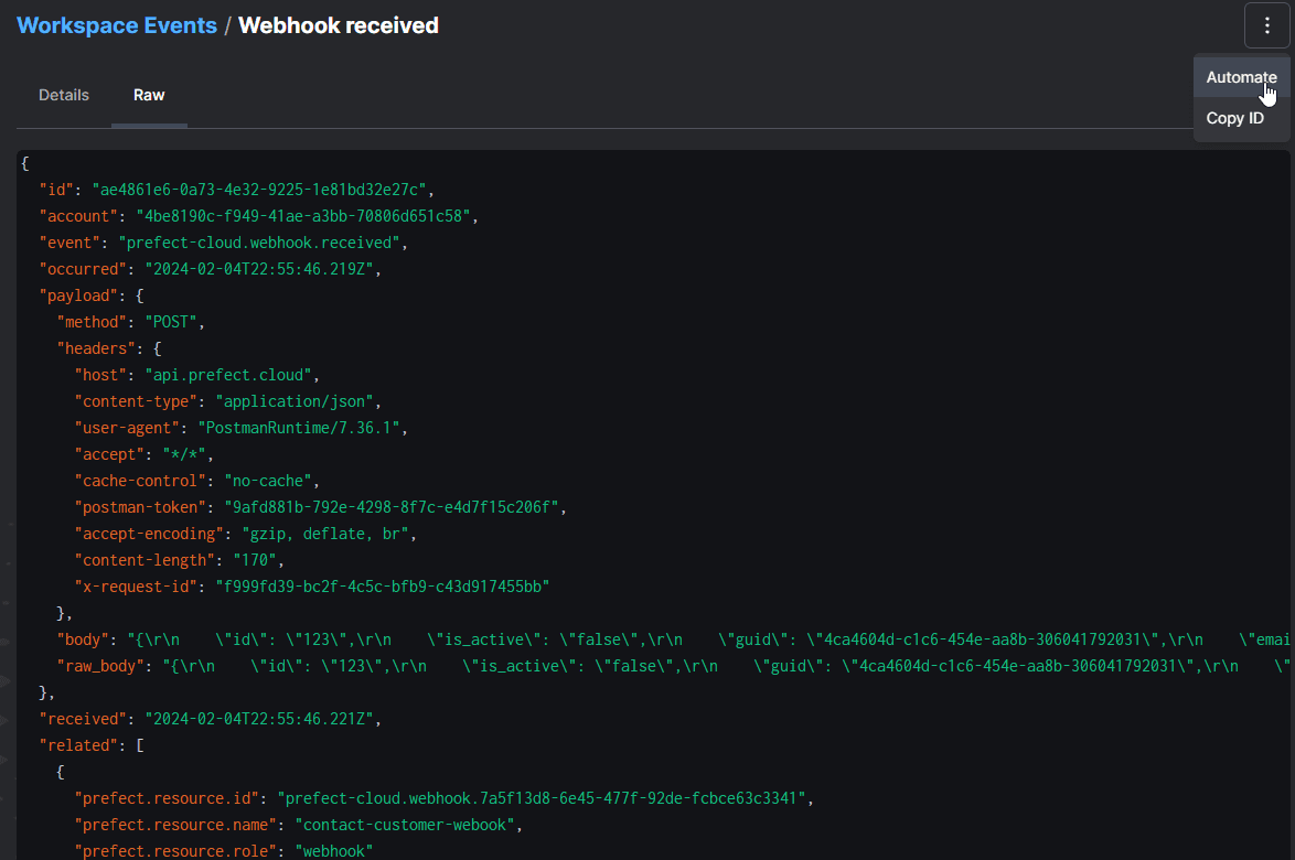 This will create an event in Prefect for the call. From the navigation menu, select Event Feed and click through to the event to see the event with all of its data. From here, you can select the dots in the upper right menu and select Automate to associate your webhook with your deployment as we’ve documented elsewhere:
