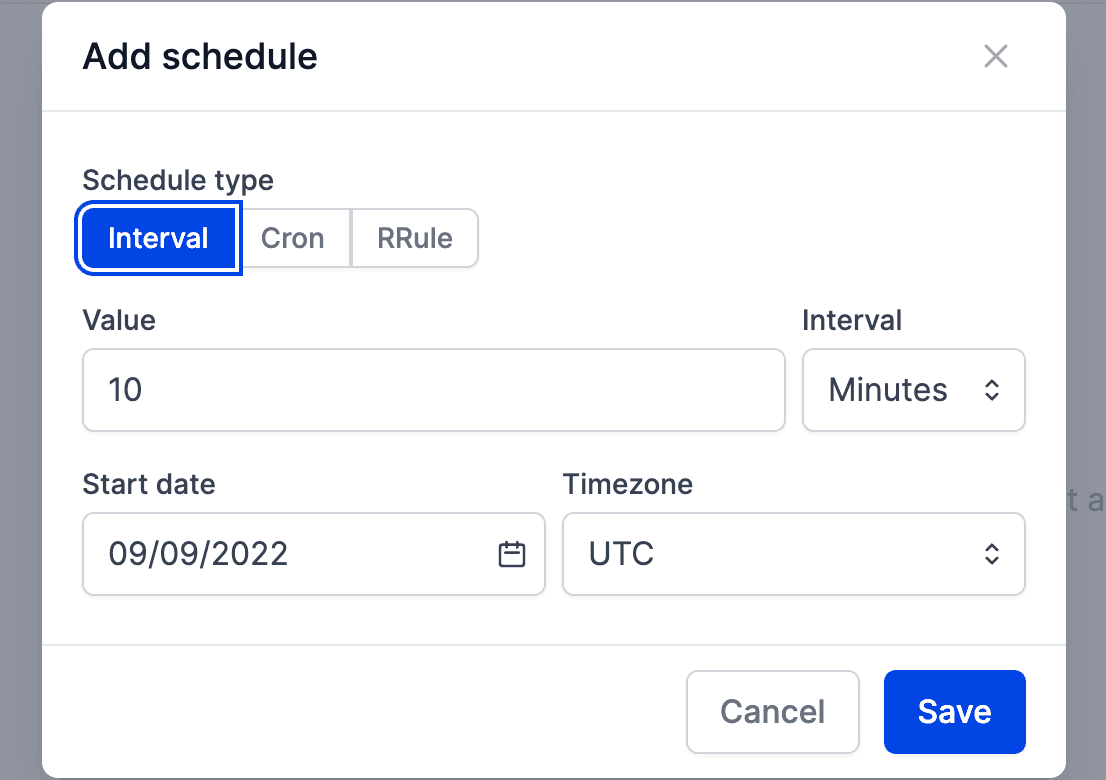 Interval is the simplest scheduler. Just specify a time interval for the deployment to run, such as every 10 minutes.